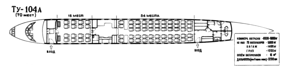 Рост пассажирских авиаперевозок привел к необходимости увеличения числа пассажирских мест в самолете, благо объемы фюзеляжа позволяли это сделать. В ноябре 1957-гозавершились испытания 70-местного Ту-104А и сразу же началось его серийное производство. В двух салонах располагалось 16 и 54 пассажира. На самолете устанавливались более мощные двигатели РД-3М-500 с