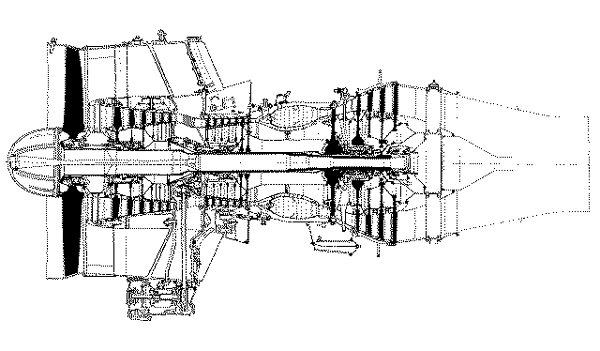 Двигатель выполнен по трехвальной схеме с осевым четырнадцатиступенчатым компрессором, промежуточным корпусом, кольцевой камерой сгорания, пятиступенчатой турбиной и раздельными нерегулируемыми соплами наружного и внутреннего контуров.