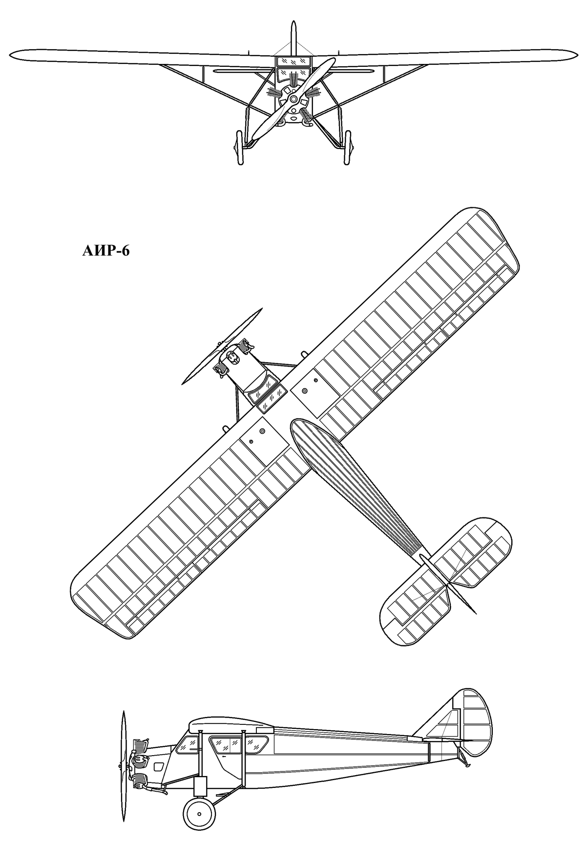 исполнение 4-5-местного АИР-5, но меньших размеров, поскольку вместо 200-сильного двигателя "Райт", купленного в США, установили отечественный М-11 мощностью 100 л.с. АИР-6 делался по заданию Осоавиахима, но по требованиям, составленным Яковлевым и согласованным с сотрудником Центрального совета Осоавиахима Л.Я.Раскиным. Самолет местной авиации предназначался для связи, тренировки