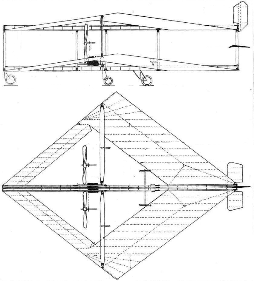 мощностью 50 л.с. (37 кВт), использующим цепи для привода пары тянущих двухлопастных пропеллеров между крыльями, при этом пилот сидел за