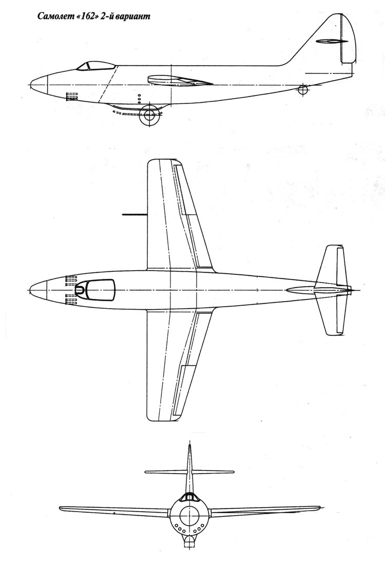 Первоначальная схема перехватчика ОКБ С.А. Лавочкина "162" принята весьма смелой - с крылом обратной стреловидности и оперением прямой