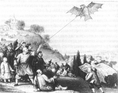Примером летательного аппарата с неподвижным крылом являлся также воздушный змей. Это устройство, представляющее собой поверхность, удерживаемую в воздухе под действием трех сил - ветра, веса и натяжения нити, впервые появилось в Китае. Дата изобретения воздушного змея точно не установлена. Большинство исследователей считают, что он появился еще в IV-II вв. до н.э., связывая изобретения воздушного змея с именами Мо Цзы, Гун Шубаня [318, с. 576 ] или Хань Синя [379, с. 174].