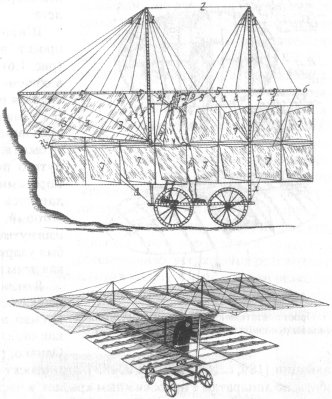 Впервые идея летательной машины с машущими крыльями была высказана в общей форме английским ученым Р.Бэконом в середине XIII в. в труде "О тайных вещах в искусстве и природе" (опубликован в 1542 г.). Бэкон писал: "Можно построить машины, сидя в которых, человек, вращая приспособление, приводящее в движение искусственные крылья, заставлял бы ударять их по воздуху, подобно птичьим" [147, с. 42].
