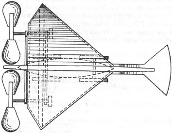 Три года спустя в Англии Г.Карлингфорд запатентовал конструкцию самолета с мускульным приводом пропеллера (рис. 2.8) [167]. Также как и у М.Лу, это должен был быть птицеподобный летательный аппарат, напоминавший при виде в плане сокола, планирующего с частично сложенными крыльями. Изобретатель писал в патенте: "Воздушная машина сделана в форме лодки с искривленными крыльями по бокам и хвостом, который может быть поднят или опущен по необходимости. Винтовой пропеллер, известный, как "винт Карлингфорда", смонтирован на наклонном валу спереди и приводится в движение вручную с помощью соответствующей передачи... Рама крыльев сделана из полых реек и обтянута сеткой и покрытым лаком шелком с обеих сторон. При отсутствии ветра машина может стартовать, подвешенная между вертикальными стойками и устремляемая вперед грузом и тросом, протянутым через блоки".
