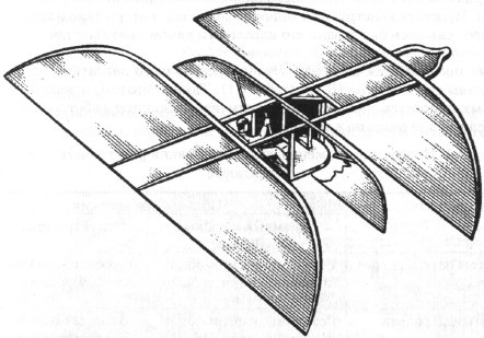Сведения о первом проекте Кейли (1799 г.) дошли до нас в виде гравюры на серебряном диске, который в настоящее время хранится в Музее науки в Лондоне. На рисунке, сделанном ученым, изображена лодка, над которой под некоторым углом размещено прямоугольно крыло (рис. 2.1, а). Горизонтальное перемещение аппарата должно было осуществляться с помощью весел, движимых сидящим в лодке человеком. Позади крыла имелось крестообразное оперение. Оно могло поворачиваться на шарнире для управления в полете.