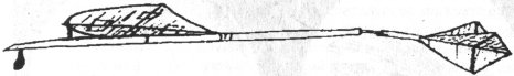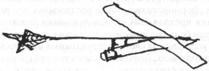 Для того чтобы устранить эти сомнения, Кейли в том же 1804 г. провел опыты с поступательно движущимся крылом, использовав в качестве экспериментального оборудования летающую модель. Сохранился рисунок (рис. 2.2) и описание конструкции этого исторического летательного аппарата: "Бумажный змей площадью 154 квадратных дюймов крепится к стержню из дерева задней частью, а передняя часть приподнята над ним с помощью шпинька так, что угол наклона составляет 6 градусов. Стержень простирается за границы змея и поддерживает хвост, сделанный из двух перекрещивающихся под прямым углом плоскостей, каждая содержит по 20 дюймов. Хвост может быть установлен под любым углом относительно стержня. ...Положение центра тяжести изменялось втыканием груза острым концом в стержень" [ 136, с. 26 ]. Вес модели составлял 108 г.