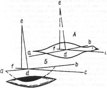 Пусть ab есть сечение обоих крыльев, противостоящих горизонтальному потоку воздуха (создаваемому их собственным движением), который может быть изображен линией cd и определяется скоростью полета птицы. Угол bdc может быть увеличен по желанию птицы и, чтобы сохранить совершенно горизонтальную траекторию полета без взмахов крыльями, должен непрерывно увеличиваться в некотором соотношении до тех пор, пока движение не прекратится совсем; но в определенный момент положение крыльев может точно отображаться углом bdc. Нарисуем dc перпендикулярно к плоскости крыльев, продолжим линию cd насколько требуется и из точки е, принадлежащей линии de, опустим ef перпендикулярно df. Тогда de будет изображать силу давления под крылом, которую можно разложить на две составляющие - ef и fd; первая характеризует силу, которая поддерживает вес птицы, последняя - тормозящую силу, от действия которой скорость движения в направлении cd будет непрерывно уменьшаться, ef - всегда известная величина, равная весу птицы, и, следовательно, fd также известна, она всегда будет относиться к весу птицы, как синус угла относится к его косинусу, так как углы def и bdc равны между собой. К тормозящей силе крыльев, определенной таким образом, присоединяется лобовое сопротивление, которое тело оказывает потоку" [170, 1809, с. 167-168].
