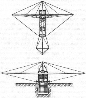 Ребенштейн не занимался разработкой конструкции аппарата. Первый в истории авиации технический проект самолета с паровым двигателем был создан в том же 1835 г. механиком из Нюрнберга Ф.Маттисом [301] (1). Согласно проекту аппарат, разработанный на основе опытов с воздушным змеем, должен был иметь плоское ромбовидное крыло, поддерживаемое лонжероном переменного сечения и системой расчалок (рис. 2.5). В центре крыла размещалась паровая машина, впереди имелся отсек для летчика и пассажиров. Управление предполагалось осуществлять с помощью расположенных позади крыла рулей высоты и направления, предусматривался также специальный груз для балансировки в полете. Для взлета и посадки служило колесное шасси. Основной материал конструкции - дерево. Для движения в воздухе должна была применяться установленная под фюзеляжем машущая поверхность. Она была снабжена клапанами, открывающимися при холостом ходе (вперед). Конструкция требовала специальной платформы для взлета с углублением посередине.