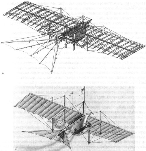 Конечно, далеко не все идеи, содержащиеся в проектах самолетов XIX в., были верными. Ранее уже отмечалось о бесперспективности предложений по установке пропеллера внутри фюзеляжа; нереальной в рассматриваемый период была также идея создания самолета с мускульным, реактивным или электрическим двигателем. К числу ошибочных следует отнести и мысль об образовании пропульсивной силы при самоколебаниях в потоке гибкой хвостовой части крыла [62 ]. Явно непрактичными были идеи о возможности превращения крыла в парашют при посадке [107, 226 ] и об использовании водорода для увеличения подъемной силы самолета [116, ф.802, оп. 3, д. 1372 ]. Не получили распространения в авиации самолеты с большим числом крыльев, такие, например, как 26-план, предлагавшийся в проекте Г.Филлипса [335].