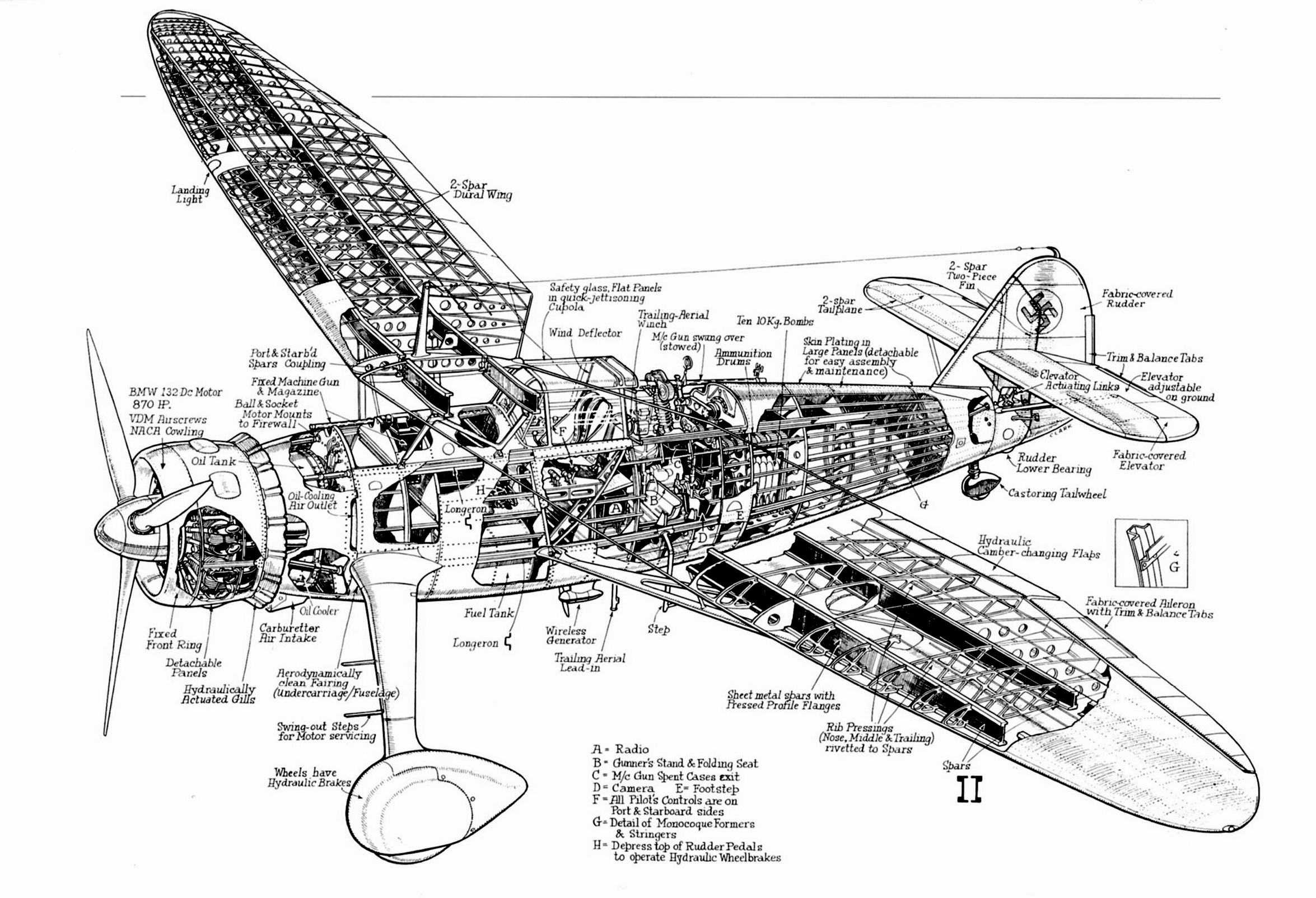 перегородкой по правому борту стоял неподвижный пулемет MG 17 калибра 7,9 мм и его патронный ящик на 500 патронов. Кабина экипажа располагалась в средней части фюзеляжа. Пилот и стрелок-наблюдатель