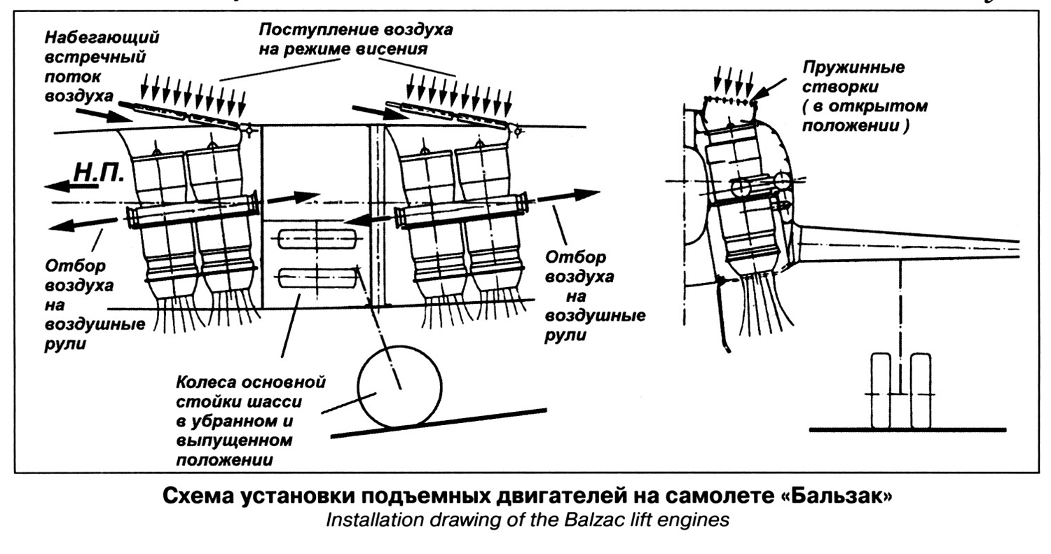 подачи воздуха в маршевый двигатель по обе стороны от оси самолета. В каждой камере расположены тандемом два двигателя. Оси подъемных агрегатов отклонены назад на 7° по отношению к