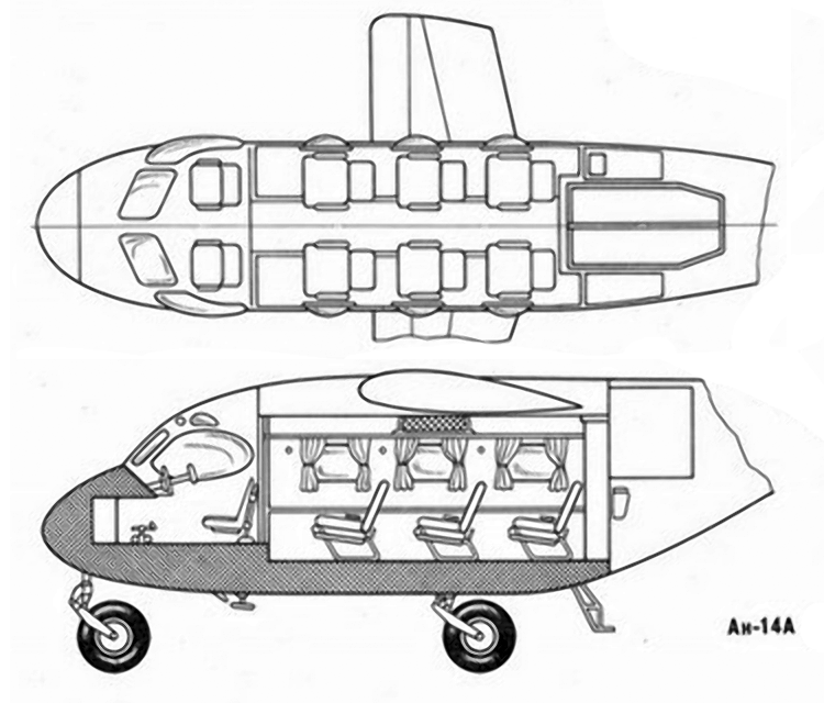 пассажиров служила задняя дверь, кстати, позволявшая десантировать и парашютистов. Согласно майскому 1956-го постановлению правительства, Ан-14 предписывалось предъявить на госиспытания в четвертом