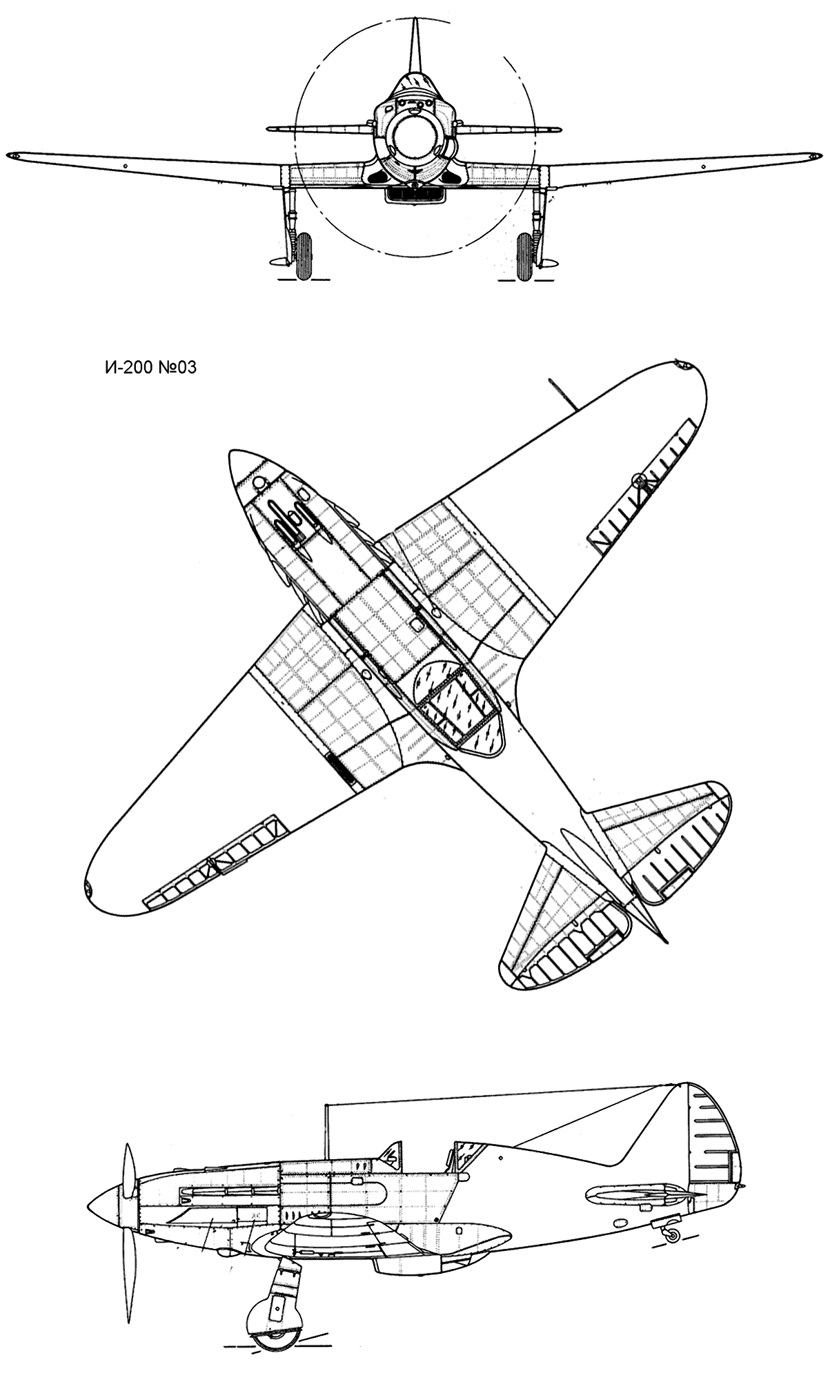 ИП-201 - модификация скоростного истребителя И-200 с двумя 23-мм пушками ПТБ-23. Самолет ИП-201 представлял собой дальнейшее развитие истребителя И-200 в сторону увеличения огневой мощи без существенных изменений в конструкции прототипа. Его вооружение должно было состоять из двух пушек МП-3 (ПТБ-23) калибра 23 мм (магазины по 60 патронов) и двух пулеметов ШКАС калибpa 7,62 мм (боезапас по 750 патронов). Пулеметом БС пришлось пожертвовать в пользу установки фюзеляжного бака увеличенной емкости (195 л.) с целью увеличения дальности полета. Пушки МП-3 конструкции Я.Г. Таубина и М.Н. Бабурина (ОКБ-16 НКВ) устанавливали в обтекателях под каждой консолью крыла (в зоне, не ометаемой винтом) на специальных металлических лафетах в районе 1-й и 4-й нервюр между главным лонжероном и передним стрингером. В перегрузочном варианте ИП-201 мог брать две 100-кг бомбы. По предварительным расчетам его максимальная скорость по отношению к И-200 должна была уменьшиться на 10-15 км/ч и составить 635 км/ч. Однако двигатель АМ-37 позволял сохранить ее на уровне 650 км/ч. Для проверки крепления пушки и ее работы под крылом И-200 был сделан действующий макет и 16 июня 1940 г. произведен отстрел в тире завода (выпущено 108 снарядов). 27 июля 1940 г. постоянная комиссия НКАП по рассмотрению инициативных проектов и предложений по самолетам, которую возглавлял Б.Н.Юрьев, одобрила эскизный проект пушечного истребителя ИП-201 и сочла его постройку целесообразной. При этом было отмечено, что максимальная скорость самолета несколько завышена и реально следовало ожидать 615 км/ч. Однако НИИ ВВС в своем заключении по эскизному проекту ИП-201, утвержденном 14 августа, отметил, что предъявленная схема вооружения является неприемлемой из-за недостаточной скорострельности пушек МП-3 (300 выстр./мин.). В связи с чем было предложено на основании принятой Начальником ВВС КА системы вооружения существующих самолетов вместо пушек МП-3 разработать установку на самолете И-200 двух пулеметов БС с боезапасом по 300 патронов.