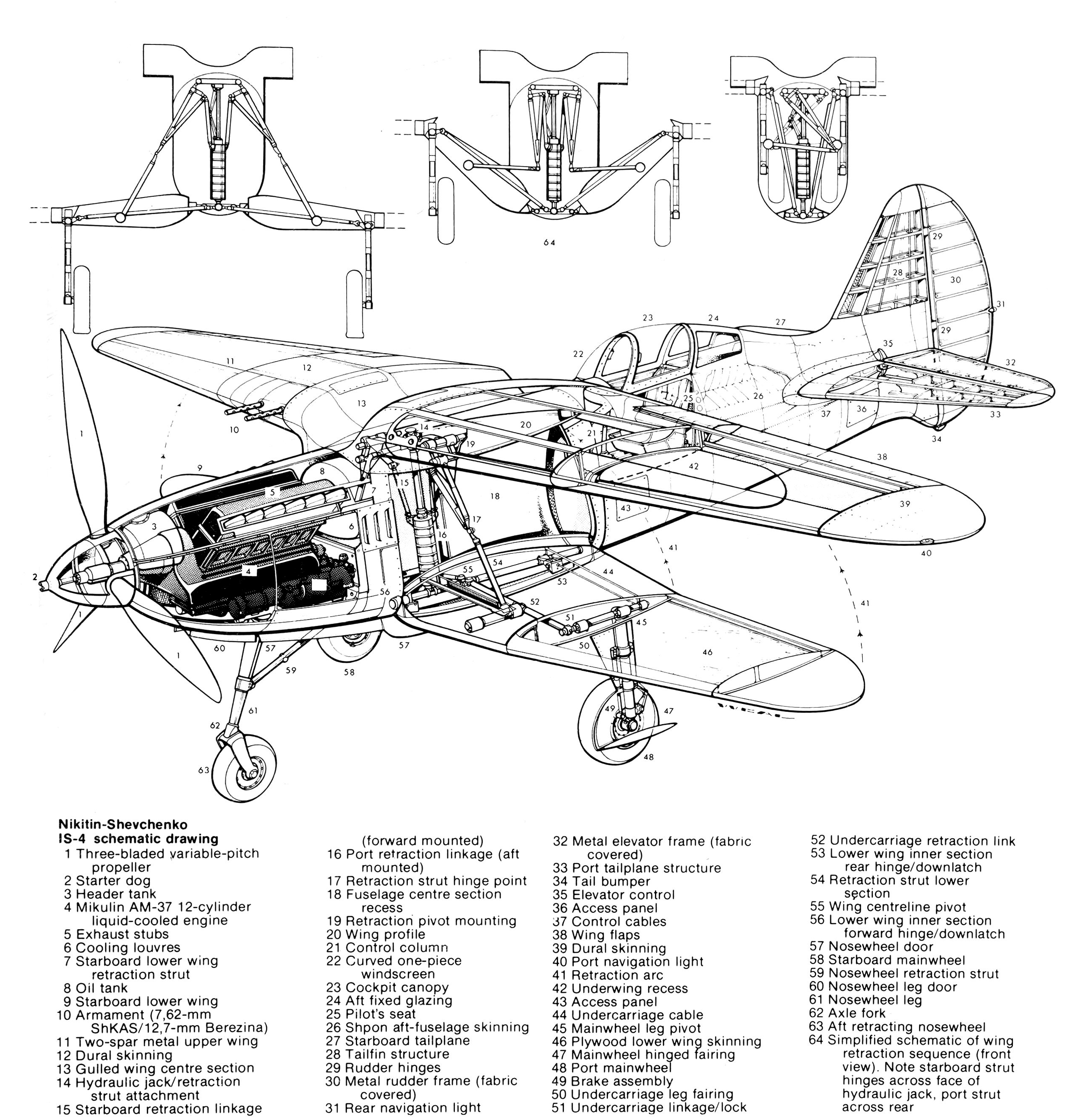 потока с фюзеляжа. Шасси убиралось в центроплан независимо от уборки нижнего крыла. Вместо открытого козырька на ИС-4 устанавливался хорошо обтекаемый фонарь. Предкрылки на верхнем