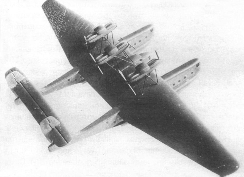 расположены три тандемных установки двигателей М-34. Воздушные винты деревянные, двухлопастные, одинакового диаметра - 4,2 м. Шаг тянущих винтов 3,35 м., шаг толкающих несколько больше - 3,96 м. Общая